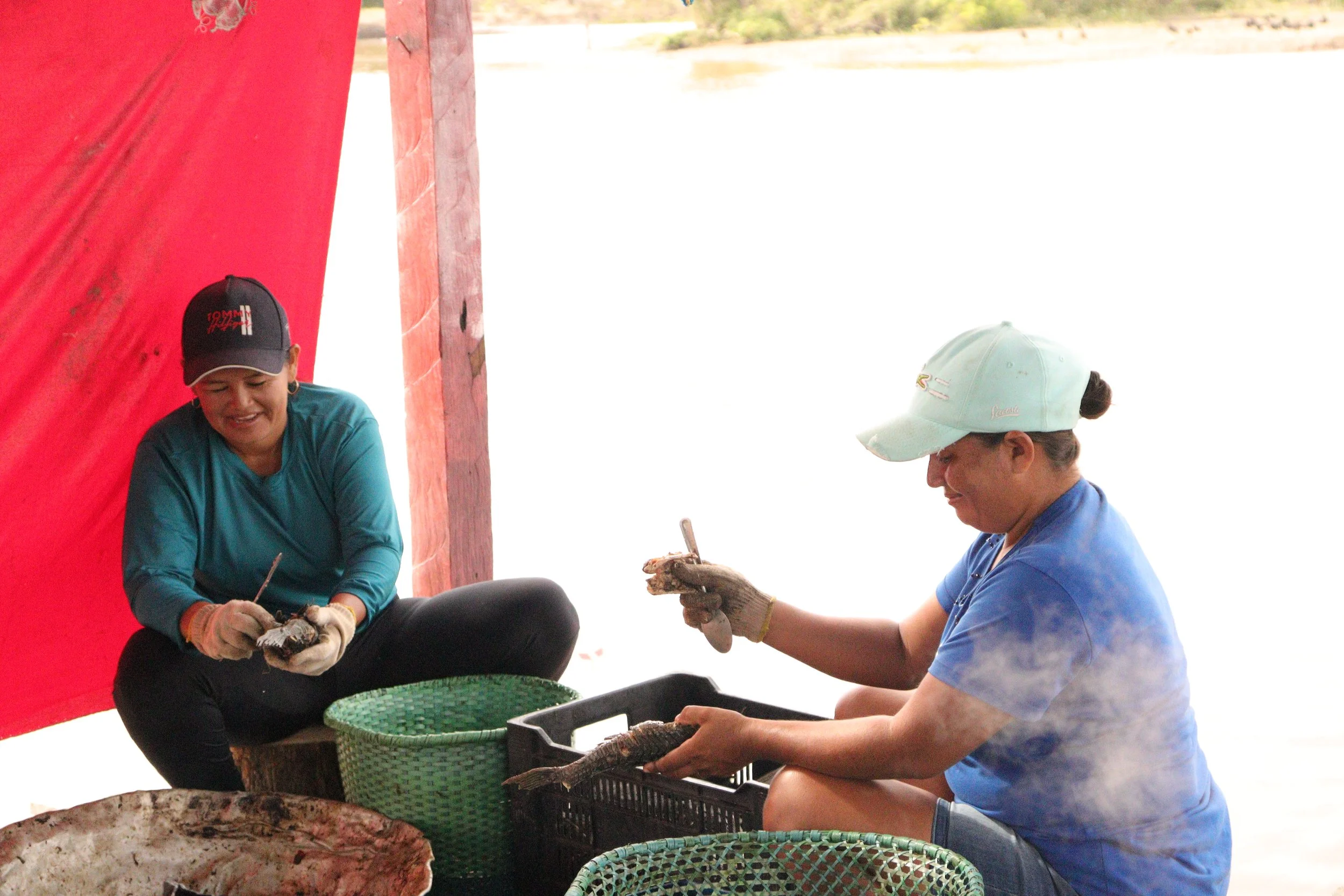 Acliane Gomes, também da comunidade Menino Deus, lembrou que o trabalho vai além da pesca e do beneficiamento. “A gente ajuda a cozinhar, preparar a lenha, carregar água, descascar o peixe. Depois vem a torra, que é feita junto com eles. Cada um tem sua parte nesse processo”.