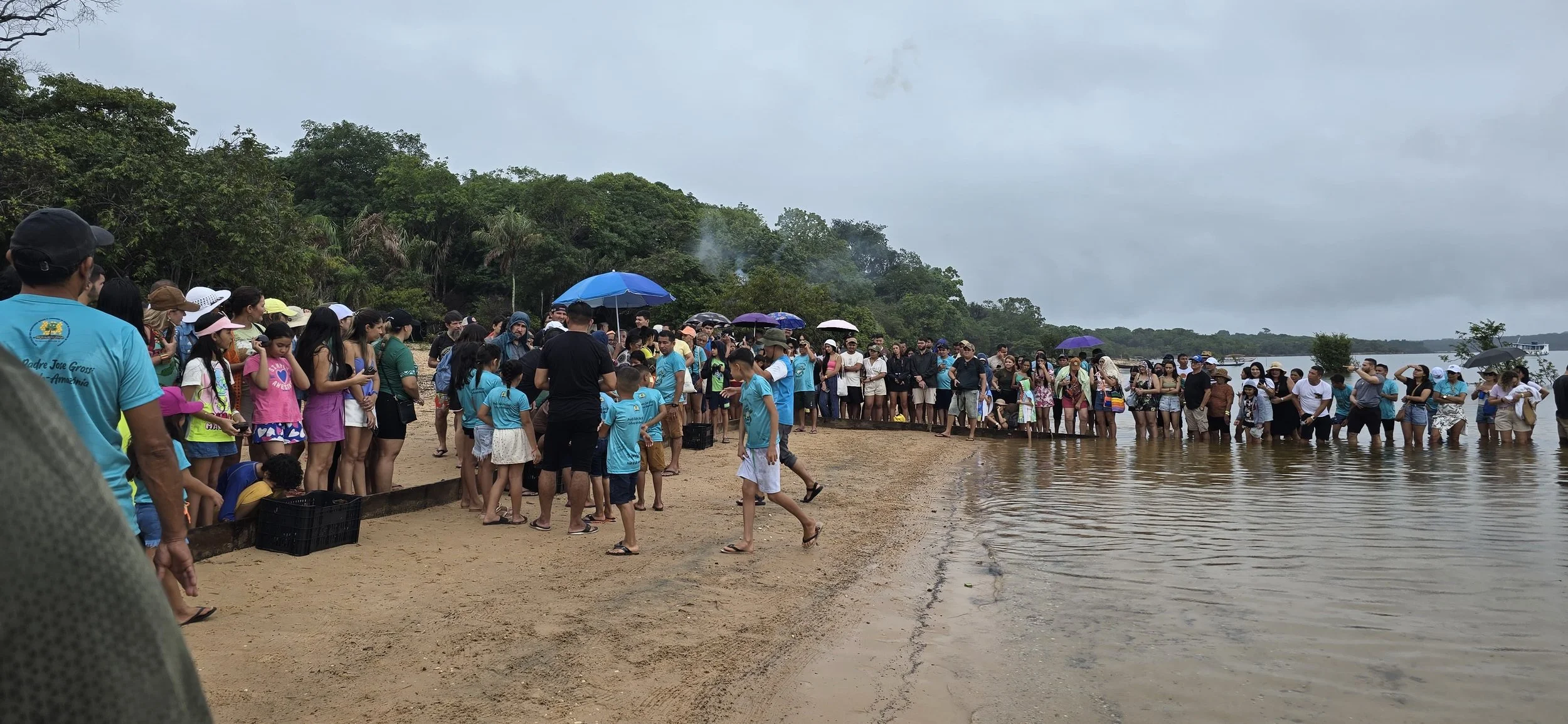 Sob muita chuva, centenas de visitantes participaram no último sábado (15/02) da soltura de mais de duas mil tartarugas na comunidade Coroca, situada às margens do Rio Arapiuns. A iniciativa, desenvolvida há cerca de trinta anos, tem contribuído para a conservação ambiental e o fortalecimento socioeconômico local, a partir da integração com o turismo de base comunitária.